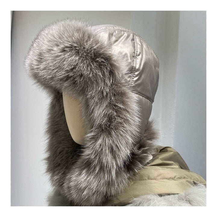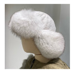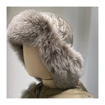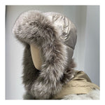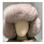 Fox fur trapper hat  has ear flaps that tie back in the neck or under the chin