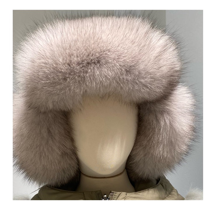 A unisex traditional fox fur trapper hat with a contemporary twist. The light fox fur hat has earflaps that tie back in the neck or under the chin with magnets.  Your ears are covered even when the earflaps are tied back in the neck.  The hat crown is made from water repellent polyester fabric, which make the hat light. The fabric color is either white, with contrast color fur, or same color as the fur.