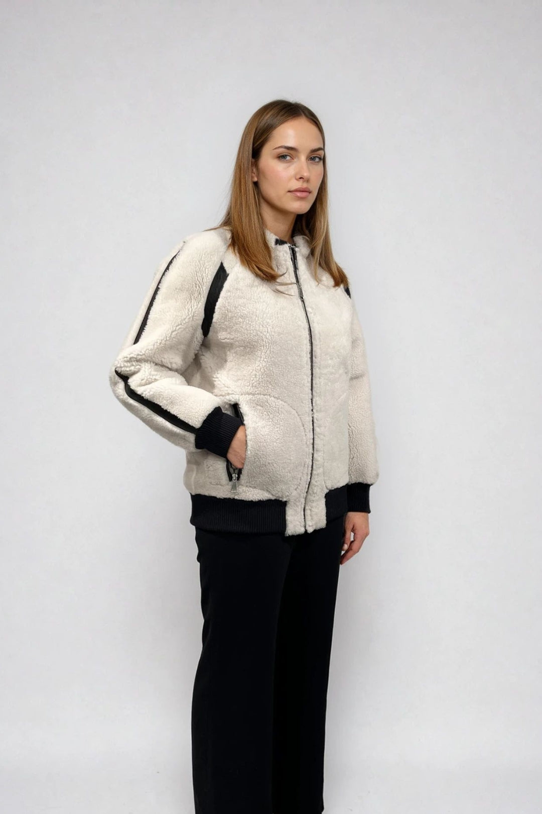 This shearling bomber jacket is part of a curated collection from the Italian fur brand, MalaMati. The jacket fits size XS/S (Italian size 42). The bomber jacket has two large pockets with zippers and black leather details.