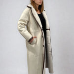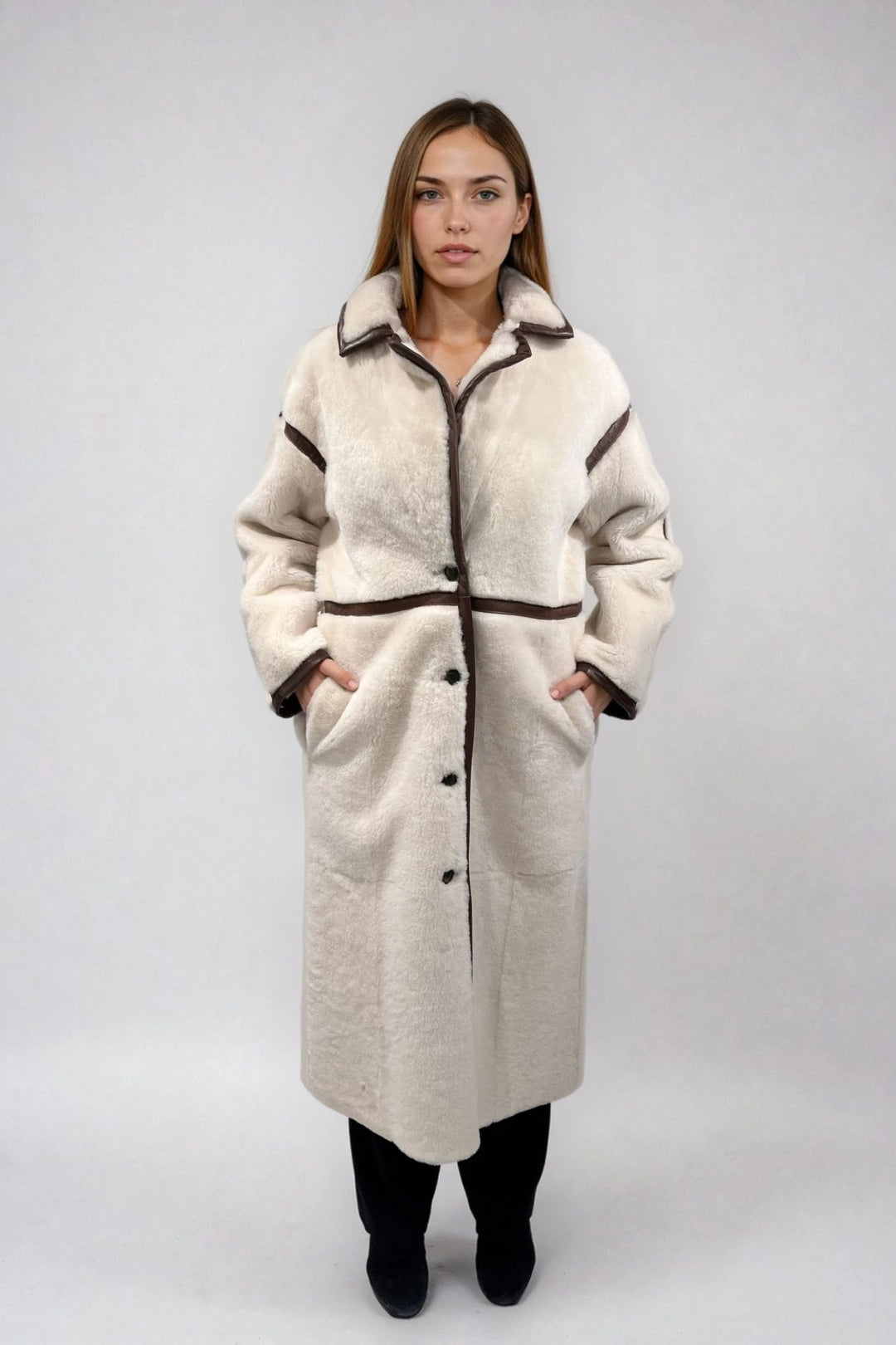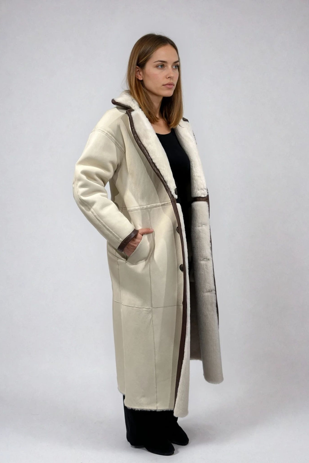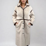 This shearling coat is part of a curated collection from the Italian fur brand, MalaMati. This beautiful white maxi coat with graphic brown leather details is reverisble, with a light vanilla tone leather on the other side.  The straight model coat has dropped shoulders and push button closing. The size is XS/S (Italian size 42).